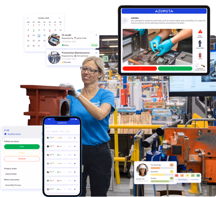 Digitize your work instructions and give your operators always up-to-date, accessible, and interactive work instructions that include videos, images, 3D files, and more. Empower your operators to create tickets to flag issues detected, gather shop floor data, and in-line quality controls. Azumuta is used for quick onboarding, retraining, and on-the-job training and can be connected with your ERP system to have your product orders always in sync with the right work instruction.